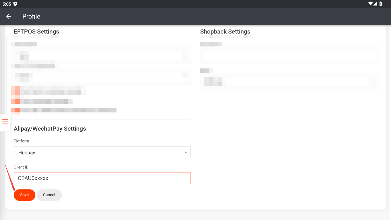 Enter the client ID, which is usually attached in the email from Huepay and starts with “CEAU”. Then click “Save”.