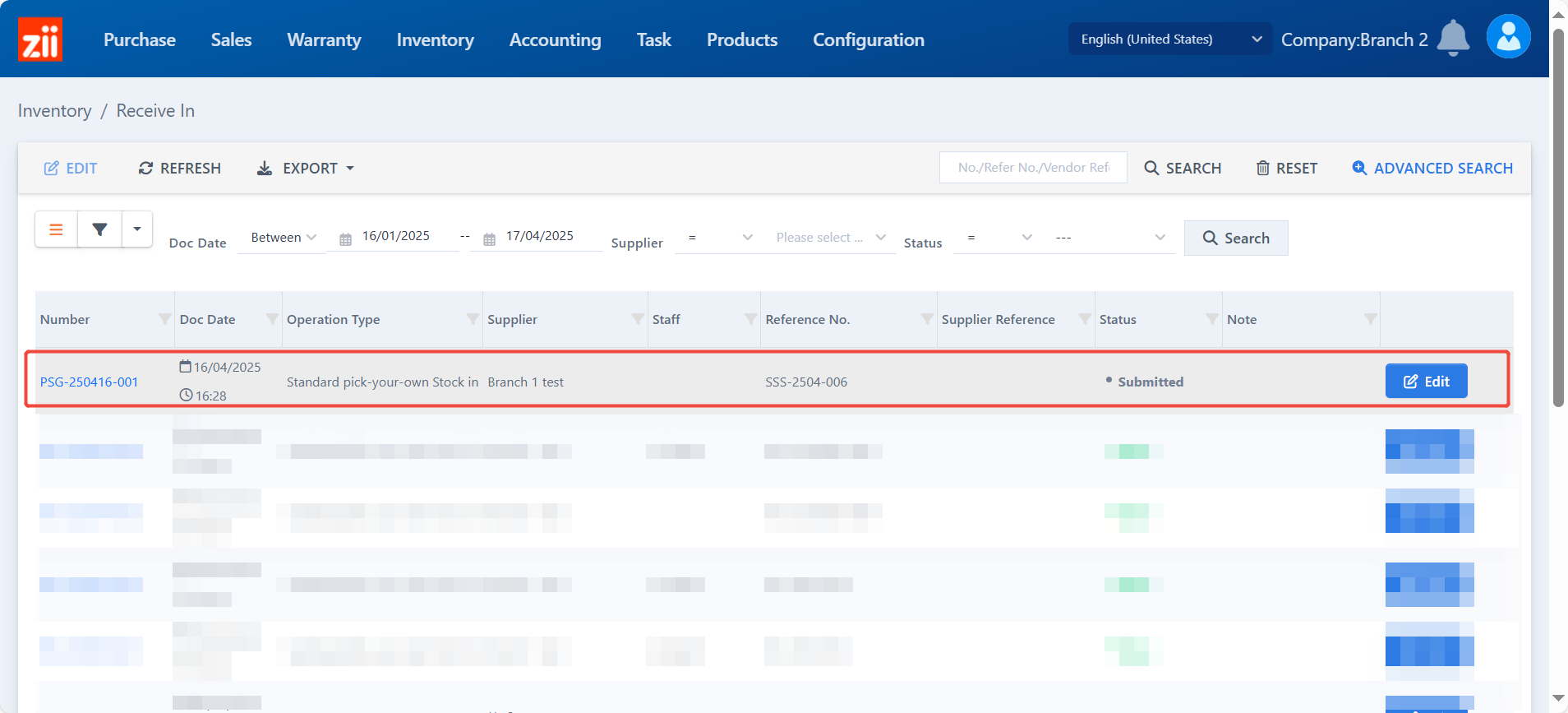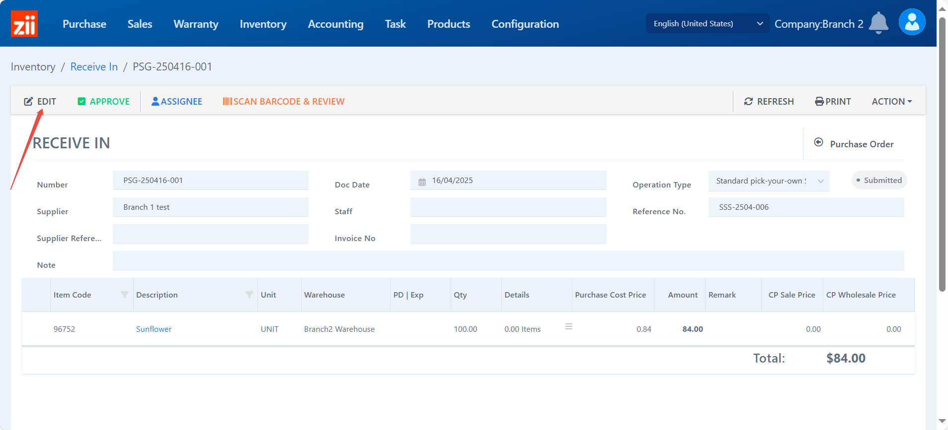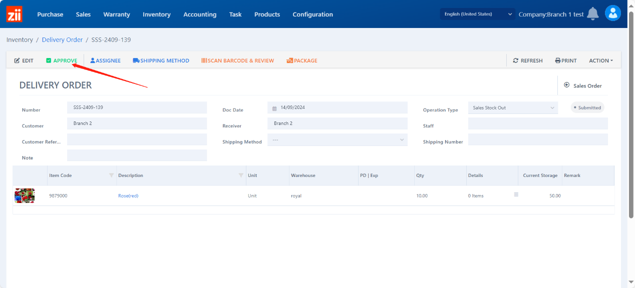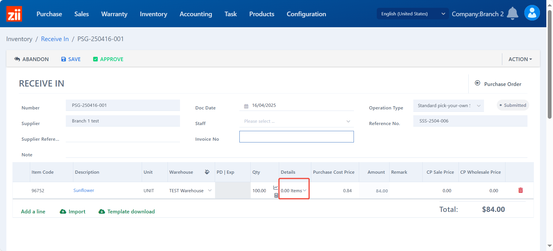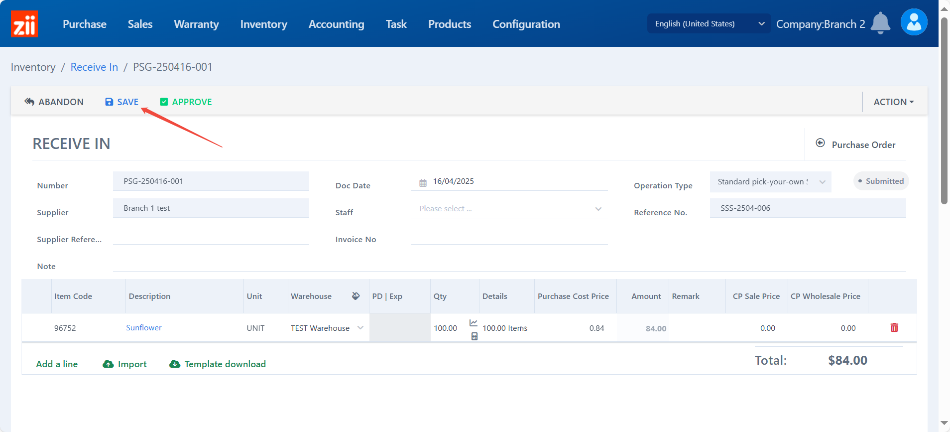 - After the delivery ticket being approved by the supplier branch, a receive-in ticket will be generated automatically. Click “Receive in”.