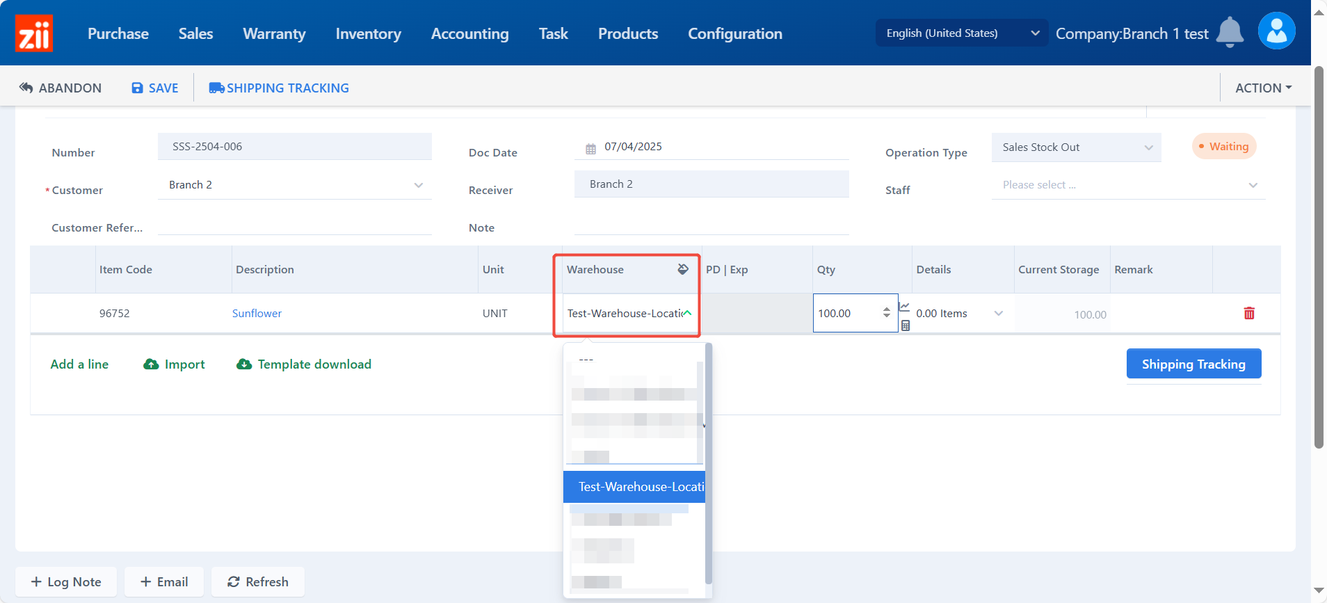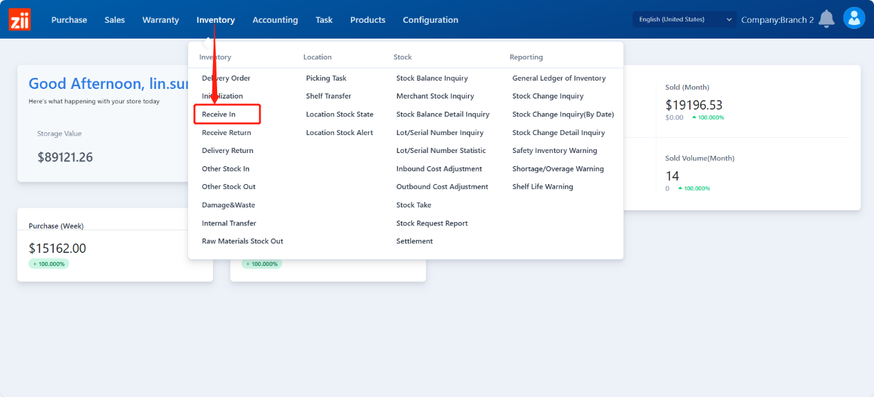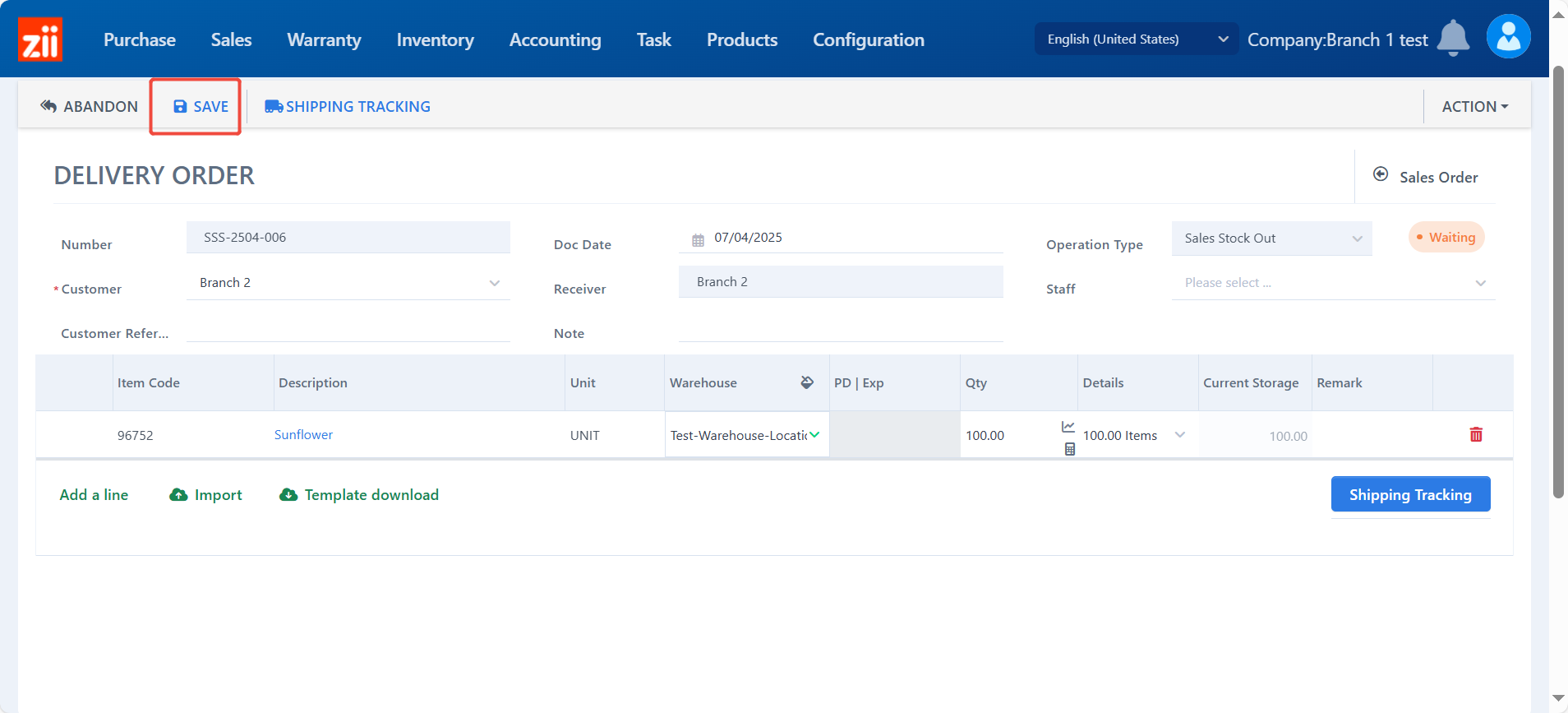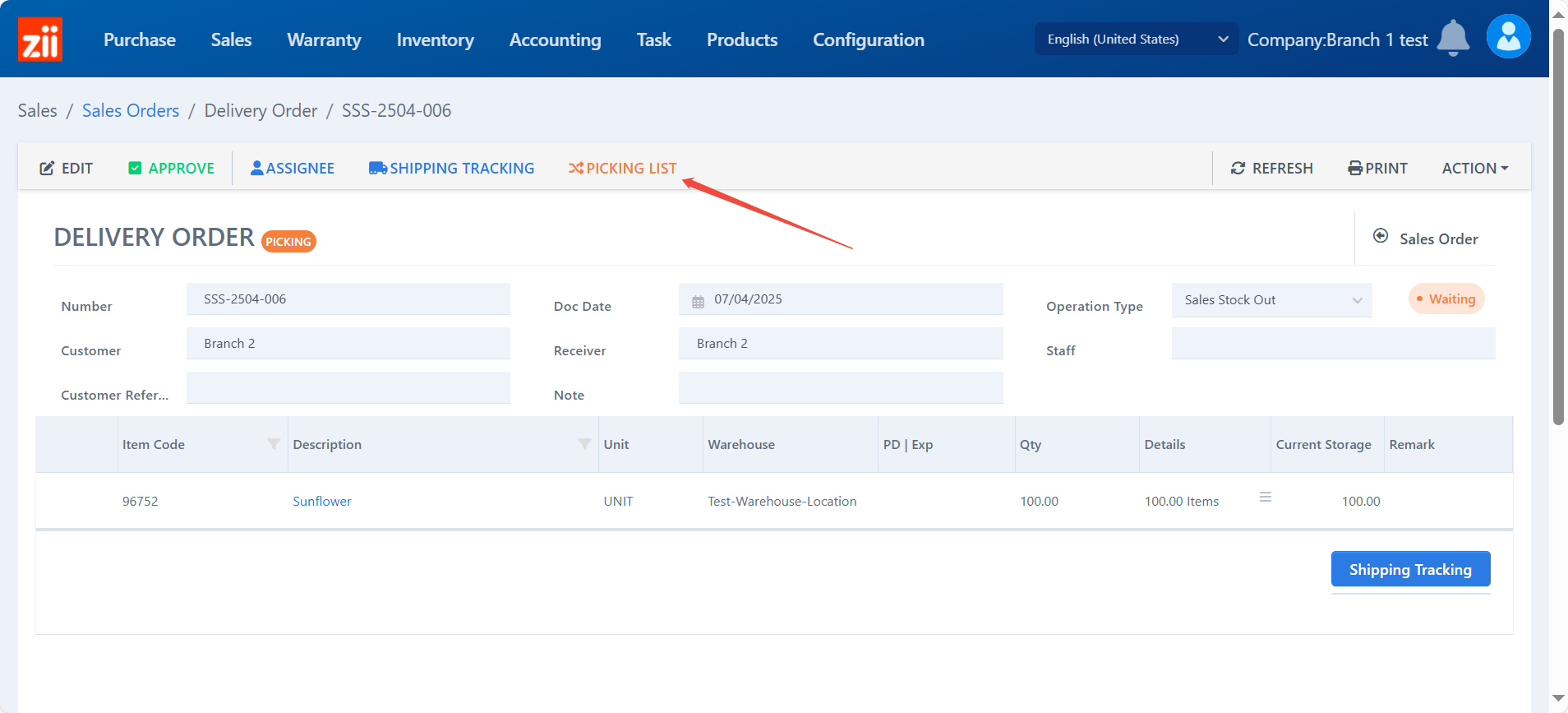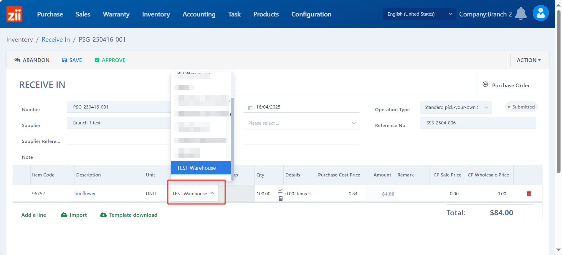 - After the delivery ticket being approved by the supplier branch, a receive-in ticket will be generated automatically. Click “Receive in”.