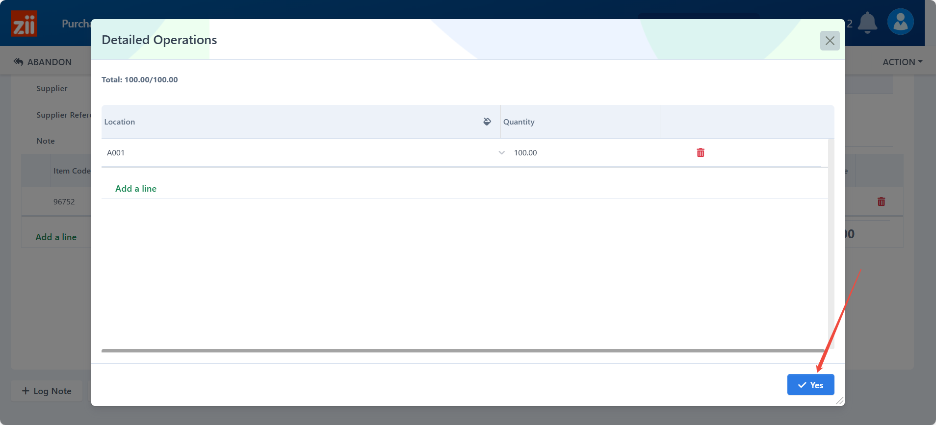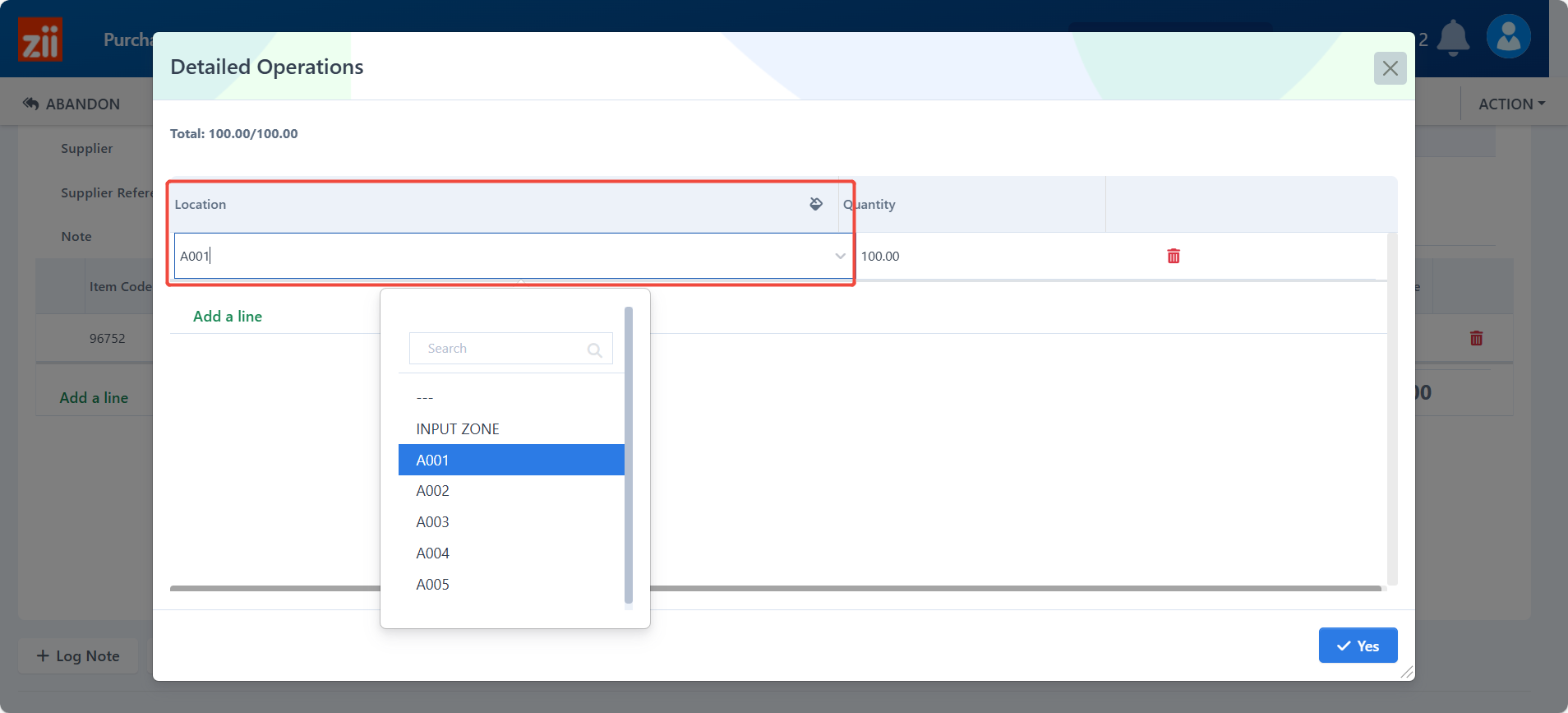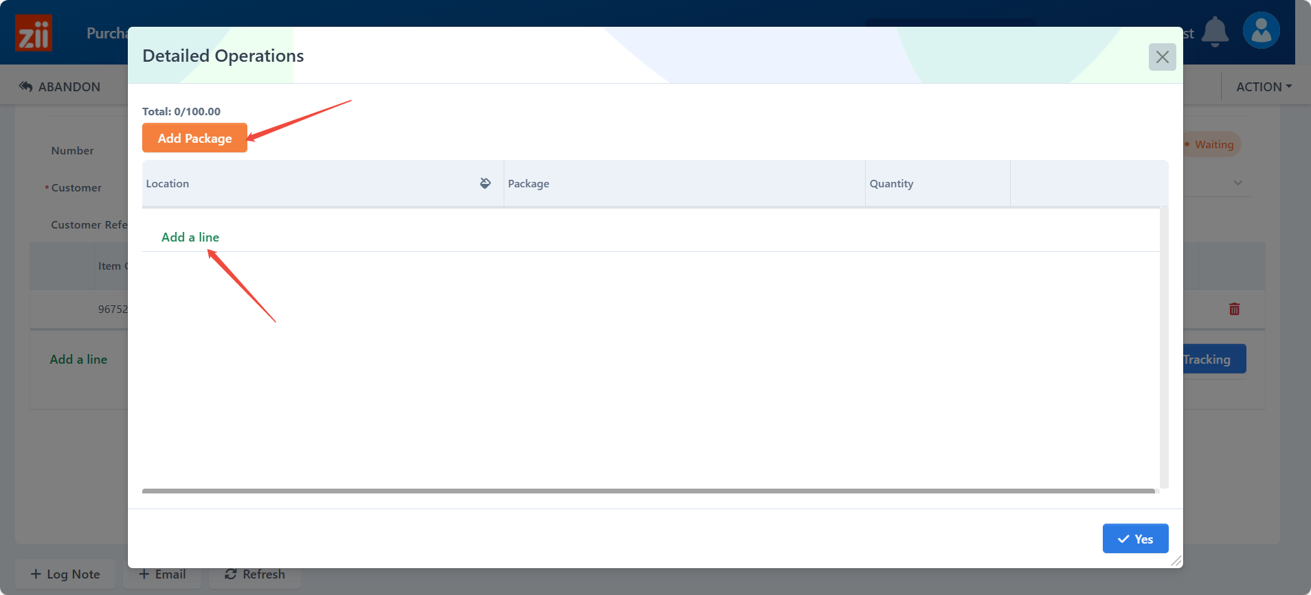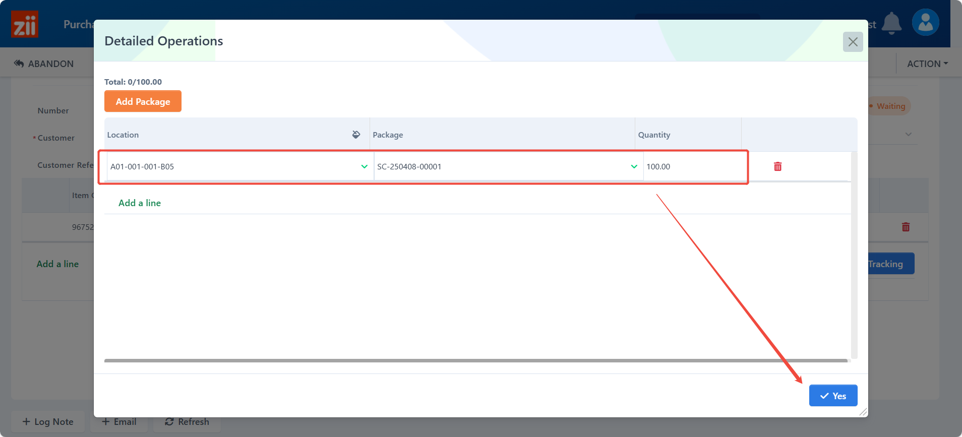 - Select the item’s location, and select the package. It will fill in the quantity automatically. Click “Yes” to save.