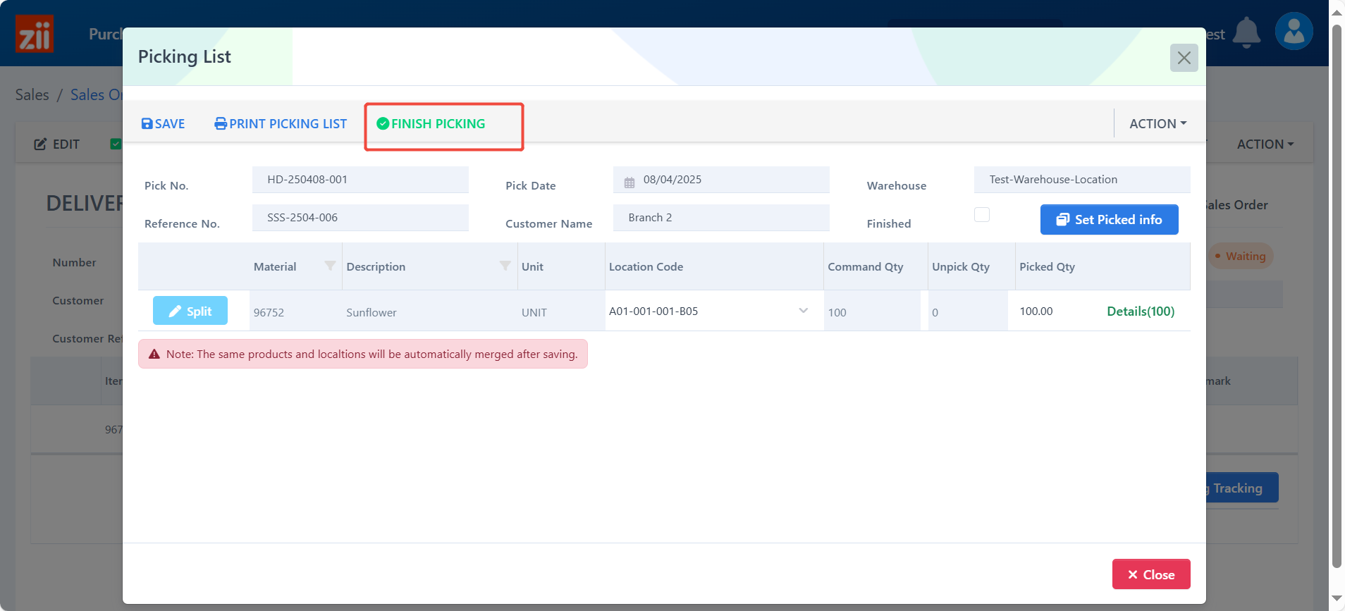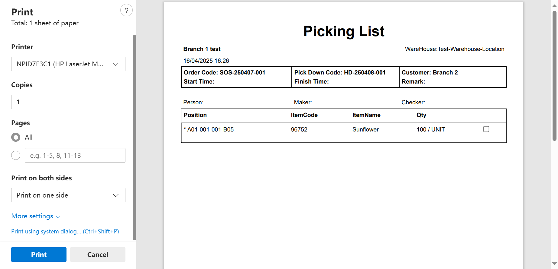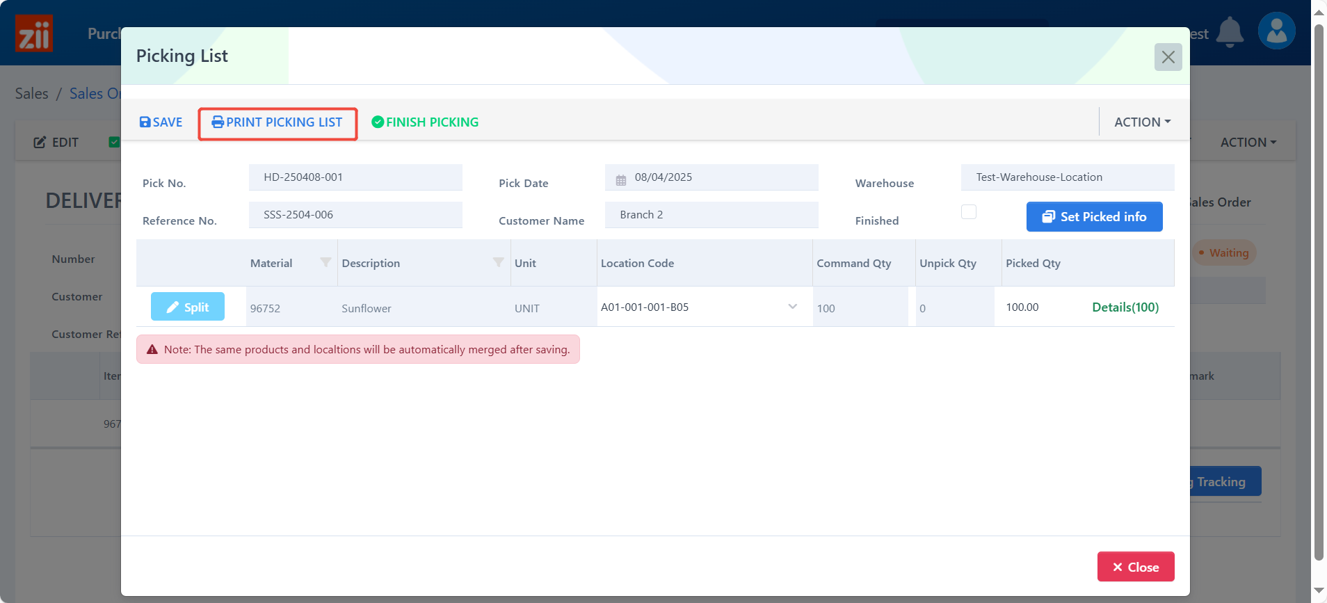 - Click “PRINT PICKING LIST” to print out a list for picking.