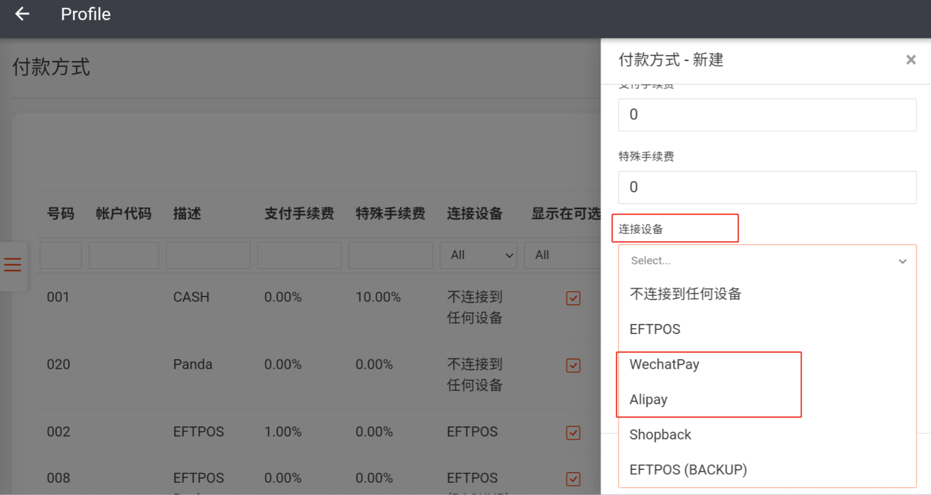 在 “连接设备” 中选择WechatPay 或者 Alipay